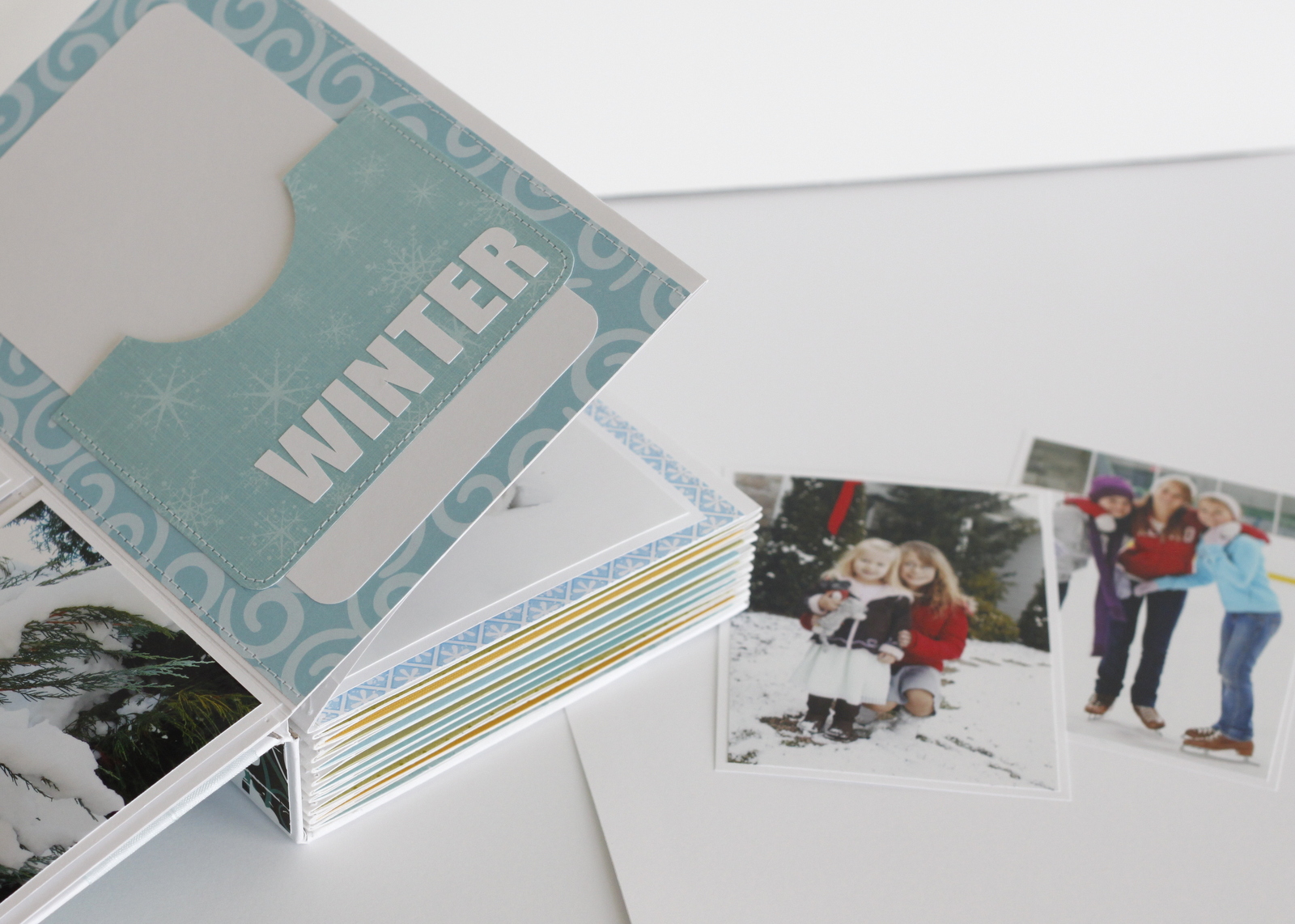 I divided this album by months (to give it some flow), adding one 5x7 photo for each spread, four horizontal pictures for inner flips and two vertical 3x4 photos for the pockets:
